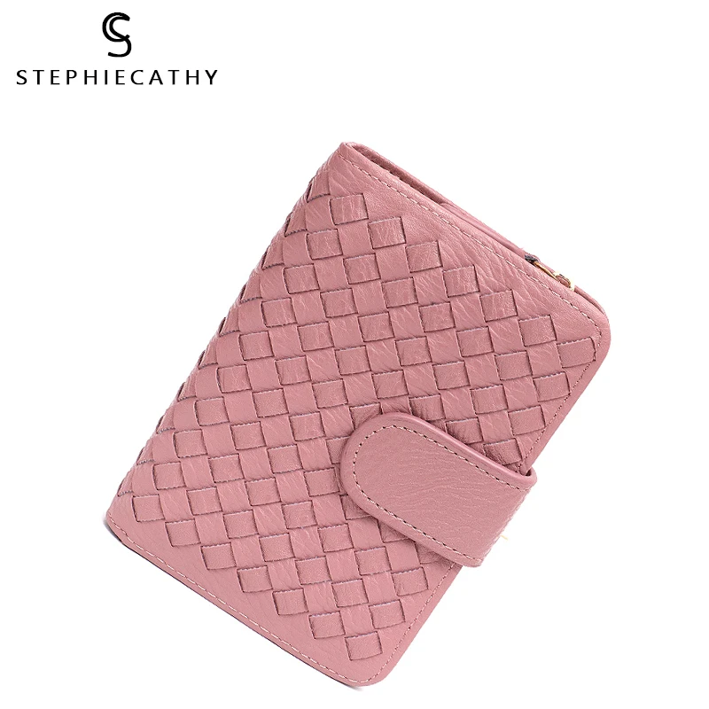 Discount SC Brand Designer Women PU Short Wallet Handmade Woven Vegan Purse Handbag Button Candy Color Funct